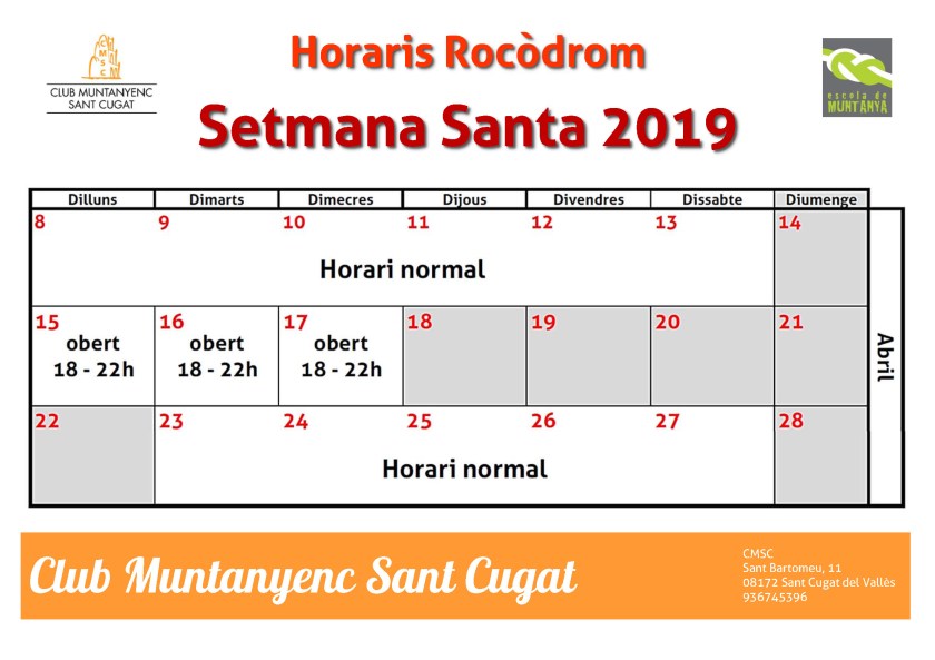 Horaris del Rocòdrom durant Setmana Santa 2019 11 Abril 2019 escolademuntanyacmsc Horaris Deixa un comentari Ja podeu consultar els horaris d’abertura del rocòdrom durant aquesta setmana santa 2019: M'agrada S'està carregant... Relacionats