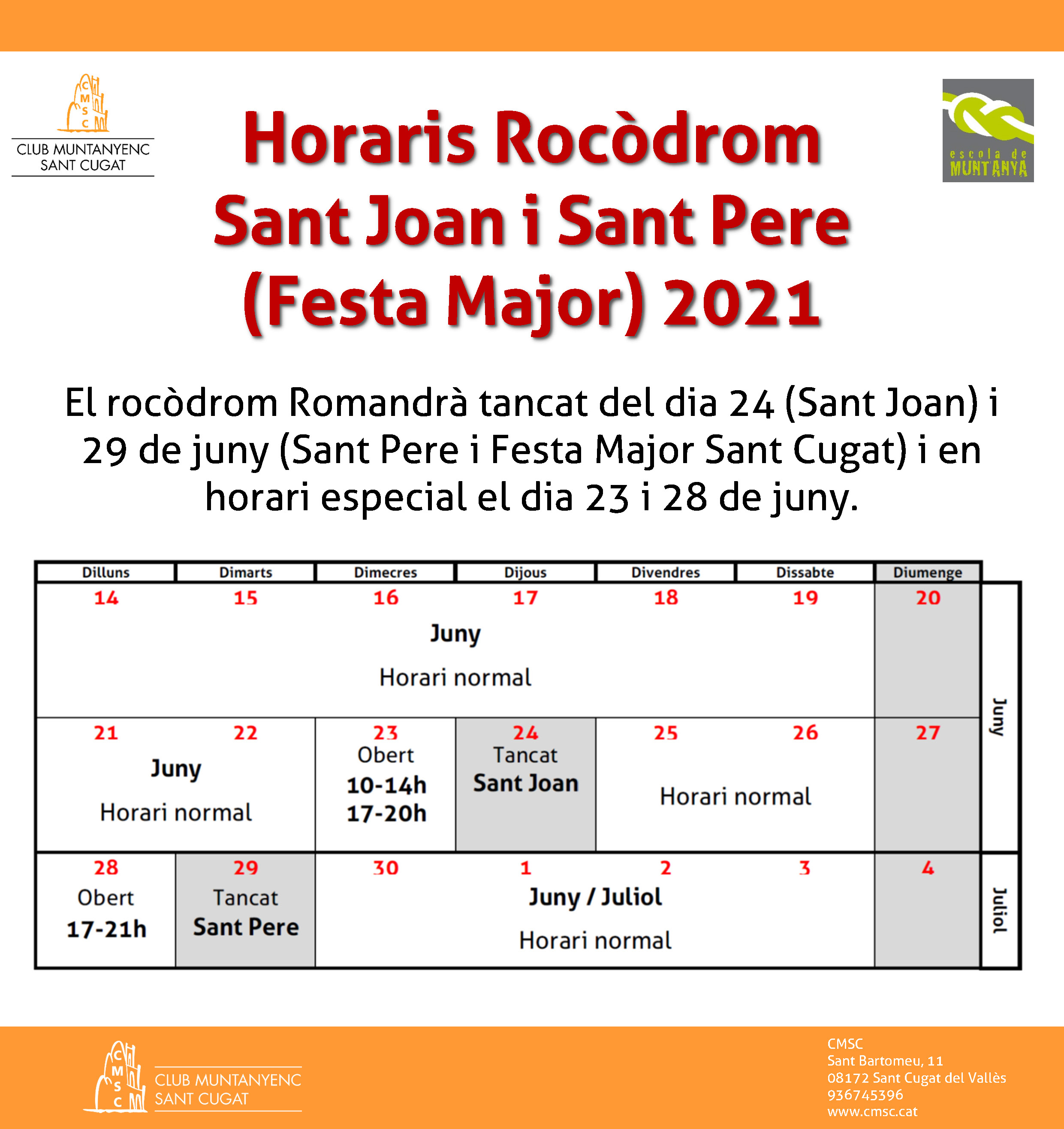 Horaris del Rocòdrom durant Sant Joan i Sant Pere (Festa Major) 19 Juny 2021 escolademuntanyacmsc Uncategorized Deixa un comentari Aquests són els horaris especials durant Sant Joan i Sant Pere (Festa Major): M'agrada S'està carregant... Relacionats