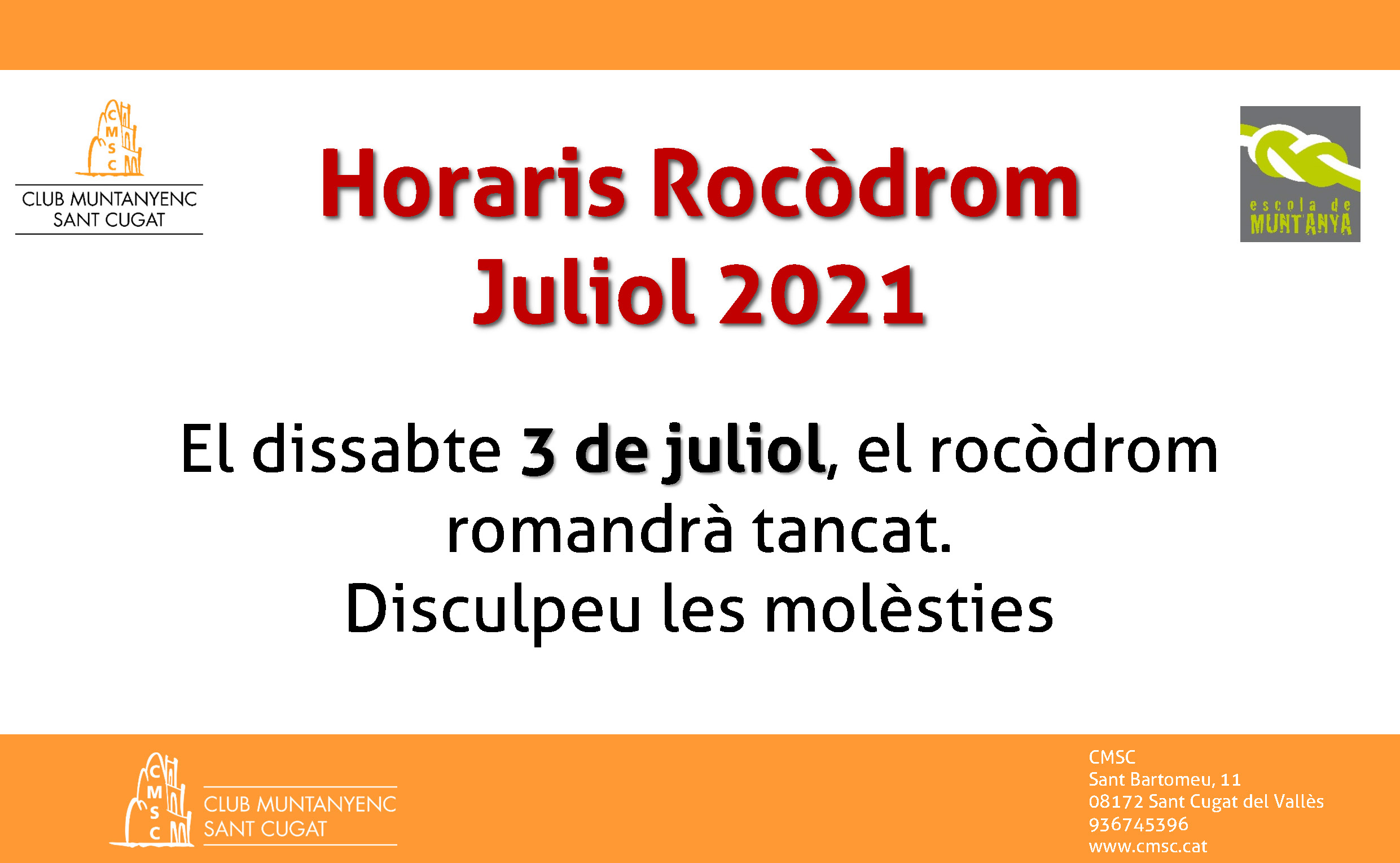 Tanquem el dissabte 3 de juliol 1 Juliol 2021 escolademuntanyacmsc Uncategorized Deixa un comentari Dissabte 3 de juliol romandrem tancats. Disculpeu les molèsties M'agrada S'està carregant... Relacionats