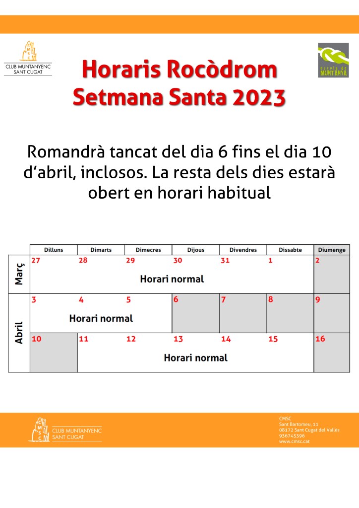 Horaris de Setmana Santa 5 Abril 2023 escolademuntanyacmsc Uncategorized Deixa un comentari A continuació teniu els horaris durant Setmana Santa 2023 del rocòdrom M'agrada S'està carregant... Relacionats
