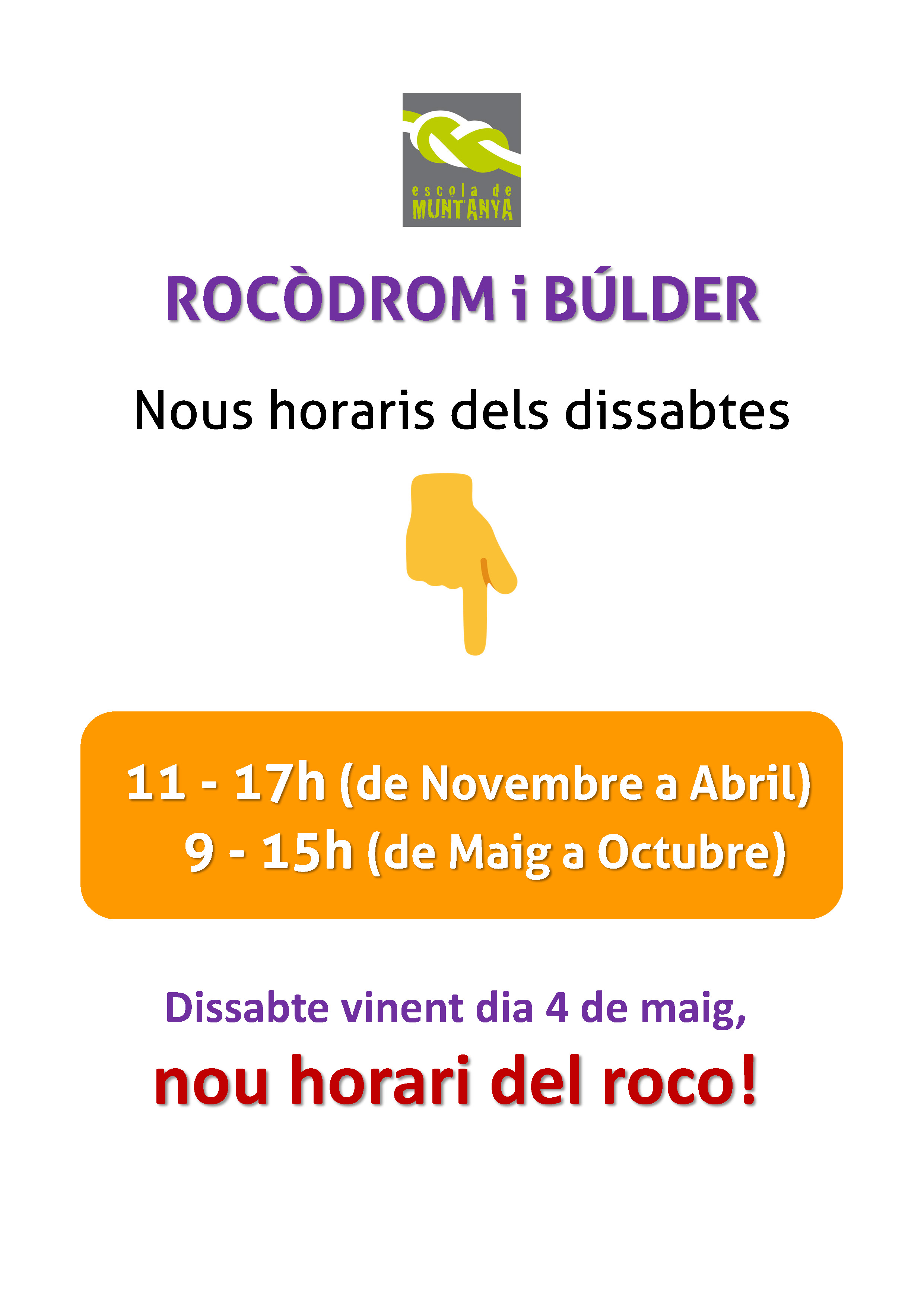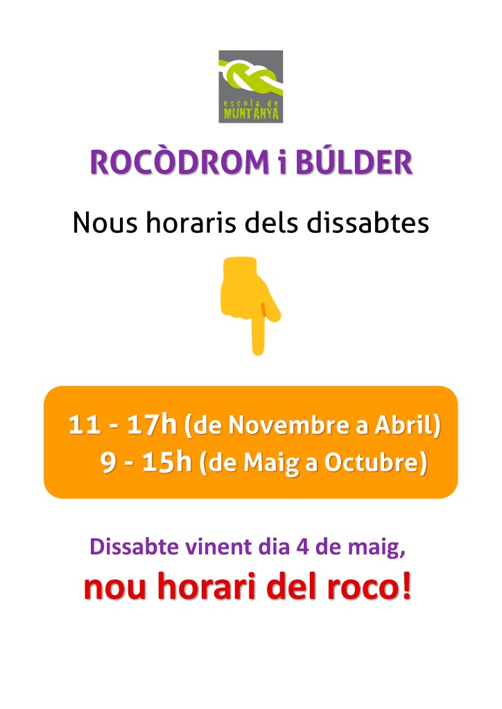 Nous Horaris del rocòdrom en dissabtes 29 Abril 2024 escolademuntanyacmsc Horaris Deixa un comentari A partir del pròxim dissabte 4 de maig començarem dos tipus d’horaris del rocòdrom, De Maig a Octubre: 9 a 15h De Novembre a Abril: 11 a 17h M'agrada S'està carregant... Relacionats